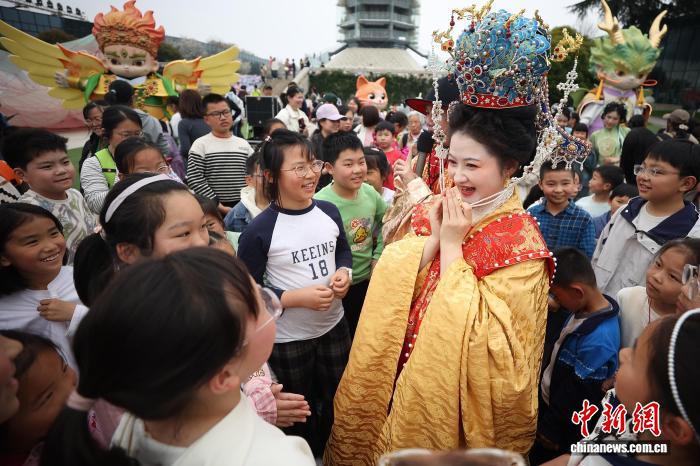 4月2日,江苏北京,孩童们正在年夜报仇寺遗迹专物馆秋日文明嘉会中取巡行的艺人互动。中新社记者 泱波 摄