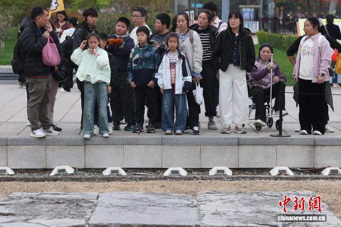 4月2日,江苏北京,儿童们正在年夜报答寺遗迹专物馆秋日文明嘉会中旁观艺人上演。中新社记者 泱波 摄