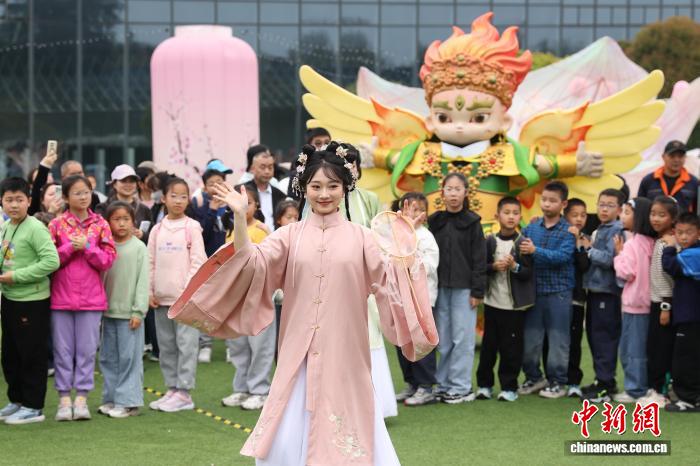 4月2日,江苏北京,儿童们正在年夜报答寺遗迹专物馆秋日文明嘉会中取巡回的伶人互动。中新社记者 泱波